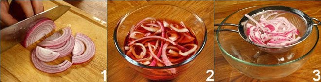 Vierte las judías junto con su agua de conserva en un colador, luego enjuágalas rápidamente bajo el agua corriente y escúrrelas bien. Pela y corta en rodajas finas la cebolla de Tropea 1, colócala en un bol con un vaso de vinagre de vino cubriéndola después con agua fría; déjala en remojo así durante aproximadamente media hora, luego escúrrela 3.