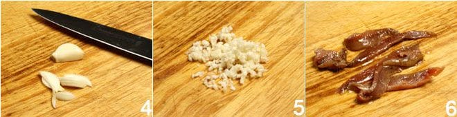 Mientras tanto, pela el ajo 4 y luego pícalo finamente y resérvalo 5. Pasa a las anchoas, colócalas en la tabla de cortar 6