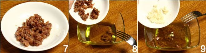 pícalas también finamente 7 y luego viértelas en un cuenco junto con el aceite 8 y el ajo picado 9