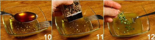 1 cucharada de vinagre 10, la sal y la pimienta molida 11 y las hojitas de tomillo 12. Emulsiona todo con un tenedor para amalgamar los ingredientes.
