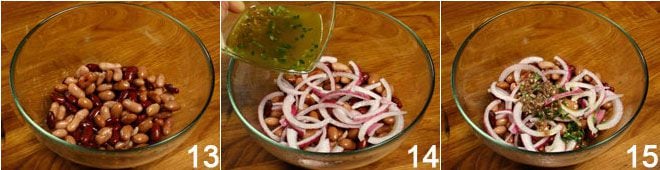 Vierte las judías en un bol 13, añade la cebolla de Tropea y la salsa obtenida previamente 14; mezcla todo y sirve, espolvoreando en los platos de servicio pimienta molida fresca y hojitas de tomillo 15.