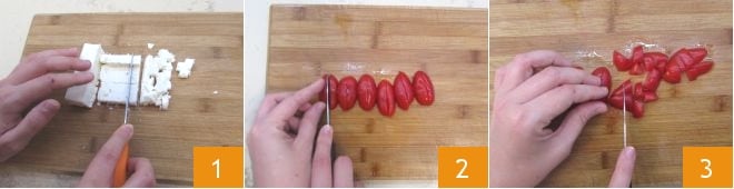 Para preparar la ensalada de pasta con los melocotones, comience cortando todos los ingredientes. Primero, corte el feta en daditos de aproximadamente medio cm 1, luego corte los tomates cherry en cuartos a lo largo 2 y luego en trocitos pequeños 3.