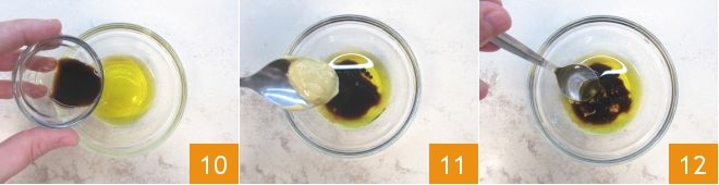 Luego prepare la vinagreta: en un bol pequeño mezcle el aceite y el vinagre balsámico 10, añada una pizca de mostaza 11 y emulsione bien batiendo con una cucharita 12 (si prefiere, puede emulsionar también con una batidora de mano o agitar los ingredientes después de colocarlos en un tarro de conserva con tapa hermética)