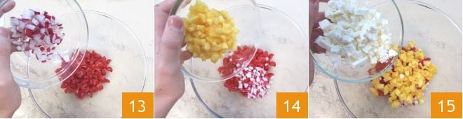 En un bol grande, reúna ahora los tomates cherry, los rábanos 13, los melocotones 14, el feta 15