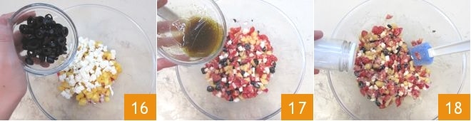 Y las aceitunas en rodajas 16, mezcle bien y condimente todo con la vinagreta 17. Finalmente, ajuste de sal 18, y déjelo a un lado.