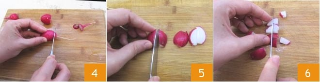 Pase a los rábanos: elimíneles los extremos y las hojas si las tiene 4, y proceda cortándolos por la mitad, obteniendo unos bastones 5 y finalmente cortando los bastones para obtener cubitos pequeños 6.