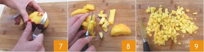Dedíquese al melocotón: pélelo 7, quítele el hueso, córtelo en pequeños gajos y de ellos obtenga cubitos 8, cortándolos nuevamente en la tabla hasta obtener una tartar gruesa 9.