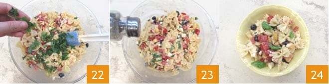 Mezcle y añada la albahaca fresca, desmenuzada gruesamente a mano 22. Espolvoree con pimienta al gusto 23, y finalmente emplate 24.