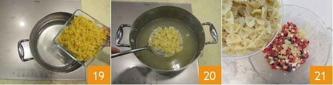 Mientras tanto, lleve a ebullición una olla con abundante agua salada, y eche las farfalle 19. Cuézalas muy al dente, de modo que al enfriarse no se pasen, escúrralas cuidadosamente 20 y déjelas enfriar después de haberlas condimentado con un hilo de aceite para que no se peguen. Una vez frías, únalas al condimento en el bol 21.