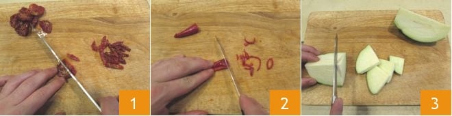 Para preparar la ensalada de pasta con berenjenas y tomates secos, comienza cortando los tomates secos en tiras finas 1. Luego, quita las semillas del chile fresco y córtalo también en tiras muy finas 2. Luego corta la berenjena en 4 partes, y corta cada parte en rodajas de 3-4 mm 3.