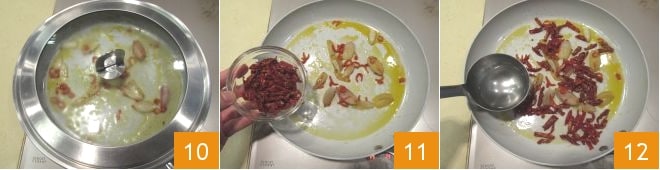 Cubre con una tapa y deja cocinar durante un par de minutos 10. Luego añade los tomates secos 11 y alarga con un poco más de agua de cocción 12.
