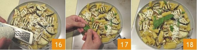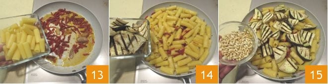 Escurre la pasta al dente, y añádela al condimento en la sartén 13. Agrega también las berenjenas 14 y los piñones tostados 15.
