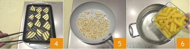 Asa las rodajas de berenjena en la parrilla caliente, durante unos 2 minutos por cada lado 4. Tuesta los piñones en una sartén antiadherente durante 3-4 minutos, teniendo cuidado de no quemarlos 5. Echa los rigatoni en agua hirviendo con sal 6.