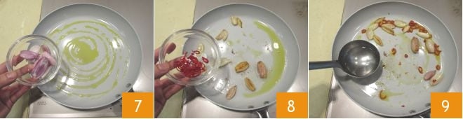 Mientras la pasta se cocina, sofríe la chalota cortada en trozos grandes en una sartén donde hayas calentado el aceite a fuego alto 7, luego añade el chile 8 y agrega un cucharón de agua de cocción de la pasta 9.