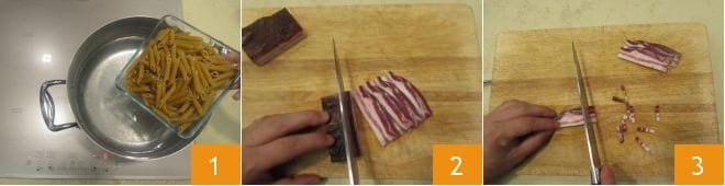 Para preparar la ensalada de pasta con peras, panceta y nueces, primero puedes poner a cocer la pasta 1. Mientras tanto, corta la panceta en rodajas y luego en tiras 3.