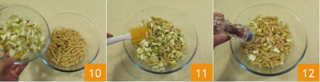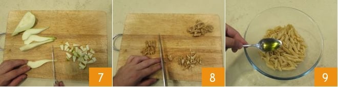 Después quítales el corazón y, sin pelarlas, córtalas en gajos y finalmente en cubos 7. Pica las nueces con un cuchillo 9 y, una vez que la pasta esté al dente, escúrrela y transfiérela a un bol grande. Agrega una cucharada de aceite 9 y mezcla para que la pasta no se pegue al enfriarse. Déjala enfriar un poco.