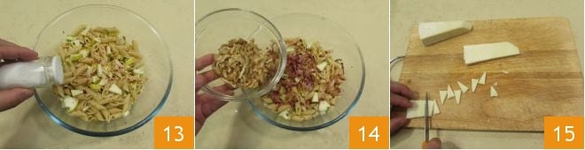 Sazona al gusto con sal 13, luego añade también la panceta crujiente y las nueces picadas 14. Finalmente, corta el pecorino en trozos 15.