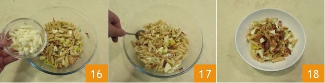 y agrégalo al bol con la pasta 16 junto con todo el condimento. Mezcla bien para que todos los ingredientes se integren 17 y tu ensalada de pasta con peras, panceta y nueces estará lista para servirse 18!