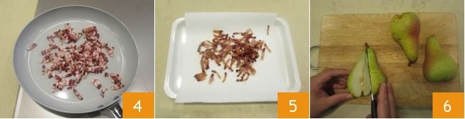 Sofríela en una sartén antiadherente durante unos 3 minutos a fuego alto (sin añadir otras grasas) y, una vez lista, cuando esté bien crujiente, colócala sobre una bandeja cubierta con papel absorbente 5. Luego lava las peras y córtalas primero por la mitad 6.