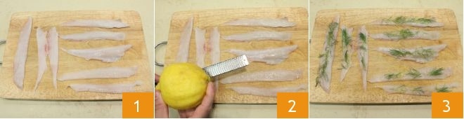 Para realizar los rollitos de lenguado con jamón serrano, corta por la mitad los filetes de lenguado y colócalos sobre una tabla de cortar 1 (si has comprado un lenguado entero, tendrás que limpiarlo y filetearlo, para ayudarte puedes seguir nuestra ficha Cómo limpiar el lenguado). Sala y sazona los filetes con la ralladura de limón 2 y ramitas de eneldo 3.
