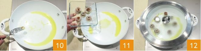 extrae el ajo con unas pinzas 10 y coloca los rollitos en la cacerola 11. Tapa con la tapa 12 y cocina por 10 minutos