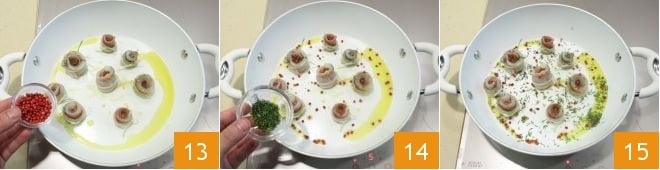 luego aromatiza con pimienta rosa en grano 13 y eneldo picado 14. ¡Los rollitos de lenguado con jamón serrano están listos para ser llevados a la mesa, bien calientes 15!