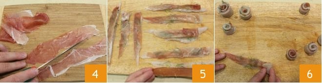 Corta el jamón en lonchas finas del tamaño de los filetes de lenguado 4 y colócalas encima de cada filete 5. Envuelve el filete para crear un rollito 6.