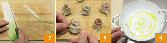 Limpia el puerro eliminando los extremos y las hojas más externas, después de quitar la primera capa de hojas, toma una y úsala para hacer tiras que te servirán para sujetar los rollitos. Corta el puerro a lo largo para obtener hilos finos 7 para envolver alrededor del rollito 8. Calienta el aceite en una sartén y dora el ajo por unos minutos 9, el tiempo necesario para perfumar el aceite,
