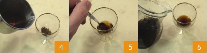 une 25 ml de whiskey 4 y mezcla bien con una cucharilla 5. Vierte 90 g de café caliente de la moka hasta alcanzar aproximadamente las 4/5 partes del vaso 6 y mezcla nuevamente.