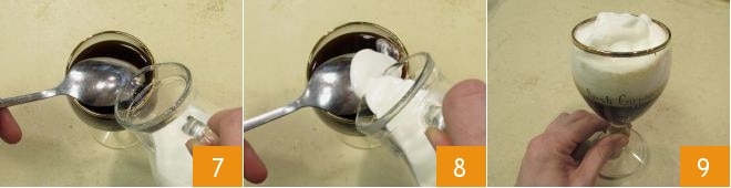 Ahora vierte la nata semi-montada en el vaso dejándola caer primero sobre el dorso de una cucharilla 7 y levantándola gradualmente a medida que la viertes 8: de este modo la nata formará una capa separada y no se hundirá en el líquido. ¡Tu café irlandés está listo para ser servido y saboreado 9!