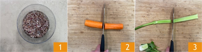 Para preparar las judías con cortezas comienza remojando las judías borlotti, durante 24 horas (o no menos de 12 horas) 1. Pela y corta la zanahoria, divídela a la mitad 2. Luego divide a la mitad la rama de apio 3.