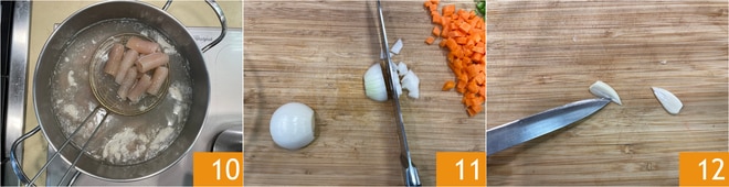 Después de este tiempo, escurre la corteza 11. Pica bastante finamente media cebolla 11, la zanahoria y el apio. Pela un diente de ajo, quítale el germen, luego divídelo a la mitad 12.
