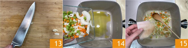 Machácalo 13 para reducirlo a puré. Resérvalo para añadirlo posteriormente. En una olla, preferiblemente antiadherente, vierte abundante aceite y calienta ligeramente, vierte el sofrito de apio, zanahoria y cebolla 14. Remueve, luego sazona con la corteza de jamón (opcional) para dar más sabor a la preparación 15.