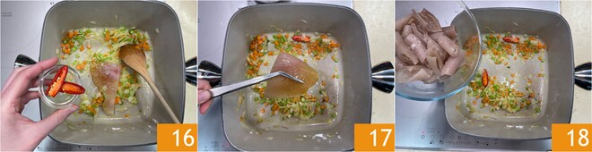 Añade también el chile fresco, dividido a la mitad 16. Si prefieres puedes quitar las semillas internas, de lo contrario déjalas. Puedes añadir también el ajo en puré en este punto. Una vez que hayas dejado saborizar durante 5-10 minutos, retira la corteza de jamón 17 y vierte las cortezas hervidas anteriormente 18.
