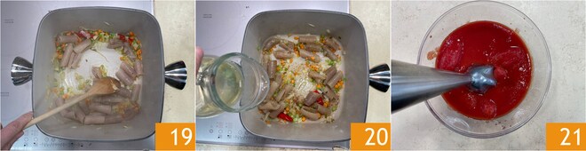 Salpimienta, y deja que se impregnen de sabor durante unos 3-4 minutos removiendo a menudo porque la corteza tiende a pegarse fácilmente al fondo de la olla y a las paredes 19. Luego puedes desglasar con vino blanco 20, deja evaporar un instante la parte alcohólica. Mientras tanto tritura los tomates pelados 21.