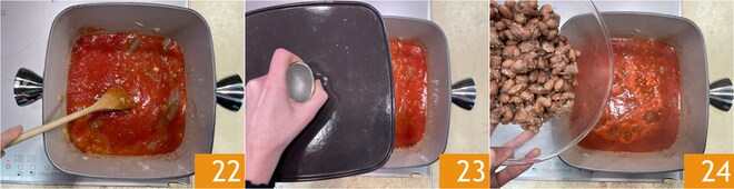 Vierte el tomate en la olla y remueve 22, ajusta la sal, lleva a ebullición y cocina durante unos 20 minutos a fuego moderado, con tapa 23. Cuando la salsa esté más cremosa, puedes añadir las judías borlotti cocidas previamente 24, cocina solo unos minutos para que se impregnen de sabor sin que se deshagan las judías.
