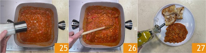Ajusta de nuevo la sal si es necesario 25, mezcla 27 y sirve las judías con cortezas con un chorrito de aceite y crutones de pan 27!