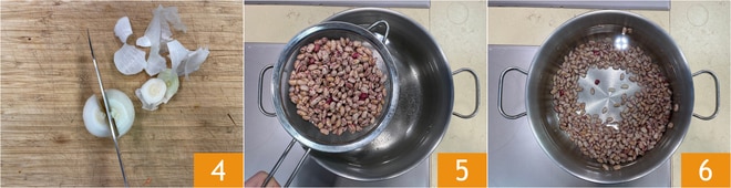 Pela la cebolla, toma la mitad 4. Escurre las judías borlotti y viértelas en una olla cubiertas con agua fría 5 6. Vierte también los aromáticos y hierve todo durante 2 horas a fuego medio-bajo cuando comience a hervir, teniendo cuidado de espumar de vez en cuando durante la cocción, si es necesario. Las judías deben estar cocidas, pero no deshechas.