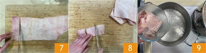 Toma la corteza, con la hoja de un cuchillo bien afilado pásala en contra del pelo para eliminar cualquier cerda residual. Luego si es necesario recorta las partes antiestéticas y más duras de la corteza, luego córtala en rectángulos 7, luego en cuadrados más o menos del mismo tamaño para una cocción uniforme 8. Hierve la corteza en agua hirviendo durante unos 20 minutos 9.
