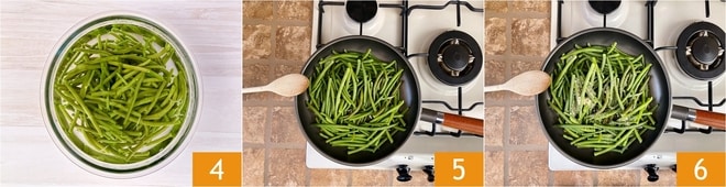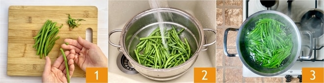 Para preparar las judías verdes agridulces, lo primero que tienes que hacer es limpiarlas. Rompe las puntas laterales 1 y lávalas bien bajo agua corriente 2. Luego hiérvelas en agua hirviendo, ligeramente salada, durante 12-15 minutos 3. La cocción exacta depende de su tamaño.