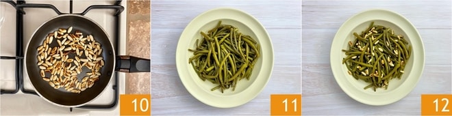 Aparte, en una sartén, tuesta los piñones a fuego lento 10. Vierte las judías verdes en una ensaladera 11, añade los piñones por encima 12 y deja que se templen antes de servirlas.
