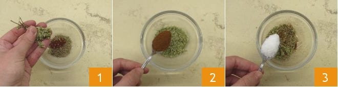 Para realizar el kebab vegetariano, lo primero es preparar la mezcla de especias mezclando todos los ingredientes en un cuenco pequeño: el comino, el pimentón dulce, el orégano seco 1, el pimentón picante 2, la sal 3 y la pimienta.
