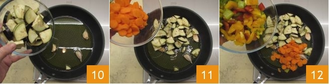 Calentad el aceite de oliva en una sartén antiadherente y sofreíd brevemente 3 dientes de ajo con piel, luego añadid las berenjenas 10, las zanahorias 11, los pimientos 12