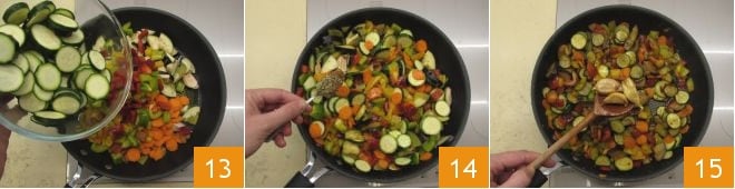 y los calabacines 13, sazonad con buena parte de la mezcla de especias 14 y cocinad a fuego alto durante unos 10 minutos hasta que las verduras estén tiernas y doradas, después eliminad los dientes de ajo 15.