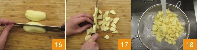 Mientras las verduras se cocinan, podéis ocuparos de las patatas: después de lavarlas y pelarlas, cortadlas primero por la mitad 16 y luego en triangulitos de unos milímetros de grosor 17. Enjuagad las patatas bajo agua corriente para eliminar parte del almidón 18 y secadlas bien.