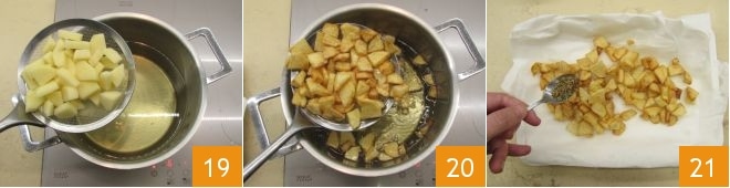 Mientras tanto calentad el aceite de semillas en un cazo pequeño y cuando haya alcanzado la temperatura de 160°-170°, sumergid las patatas con una espumadera 19 y freídlas durante unos 8 minutos hasta que queden bien doradas 20; no friáis demasiadas patatas a la vez para evitar que la temperatura del aceite baje. Escurrid las patatas fritas sobre papel absorbente y condimentadlas con la mezcla de especias restante 21, ajustando de sal si es necesario.