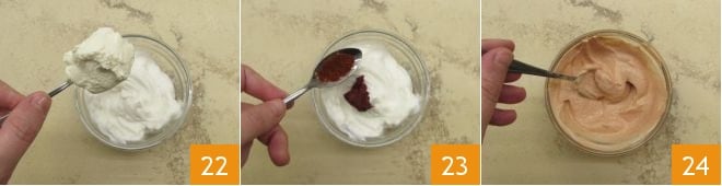 Para preparar la salsa, verted el yogur griego en un cuenco pequeño, añadid la crema agria 22, el concentrado de tomate, el pimentón dulce 23, la sal y mezclad bien 24.