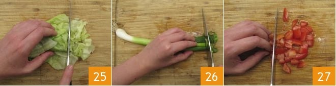 Por último, preparad las verduras crudas: cortad la lechuga en tiras finas 25, luego cortad la parte verde del cebolleta en rodajas finas 26 y los tomates en cubitos 27. Podéis secar el tomate con papel absorbente para evitar que quede demasiado acuoso.