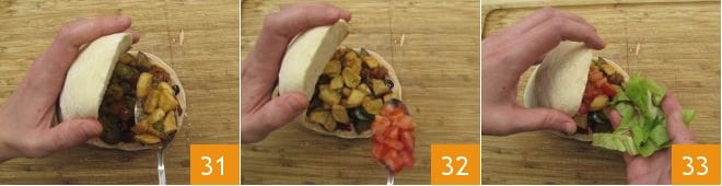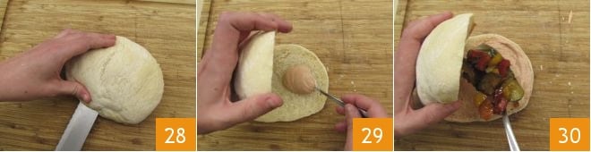 En este punto estáis listos para montar el bocadillo: cortad el pan árabe en forma de bolsillo 28 y untad la mitad inferior con abundante salsa 29, luego rellenad con las verduras cocidas 30,