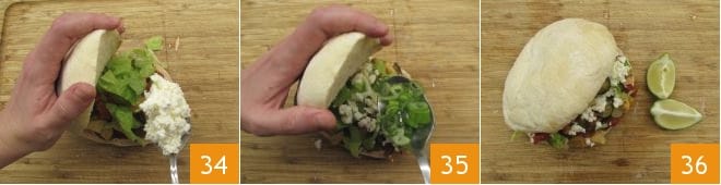 el feta desmenuzado 34 y la cebolleta 35. Añadid un chorro de zumo de lima (o limón) y vuestro kebab vegetariano está listo para ser mordido 36!